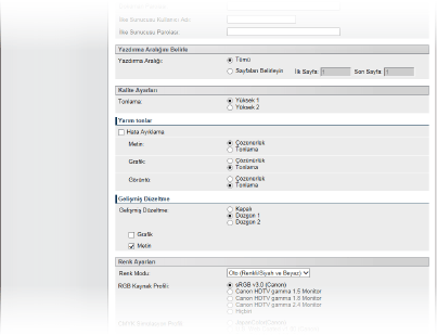 Yazdıracağınız verilere uygun profiller seçebilirsiniz. PDF ve XPS dosyaları için bir belgede bulunan her bir resim türü için bu birimi [Metin], [Grafik] ve [Görüntü] ayarlayabilirsiniz.