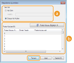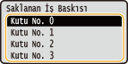 [Posta Kutuları]Bir SD kartta yazdırma verilerini saklamak için kullanılan bir bölüm, kutu olarak adlandırılır. Belgeyi saklamak için kutunun numarasını seçin. Kutunun tanınmasını kolaylaştırmak için kutuya bir ad atayabilirsiniz.