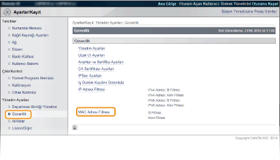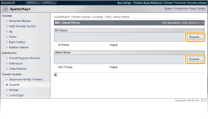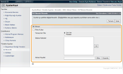 1 | [Varsayılan İlke] için [Filtre Kullan] onay kutusunu seçin ve [İzin Ver] veya [Reddet] radyo düğmesini tıklatın. [Filtre Kullan] İletişimi sınırlamak için onay kutusunu seçin. Sınırlamayı devre dışı bırakmak için onay kutusunun işaretini kaldırın. [Varsayılan İlke] Diğer aygıtların makineyle iletişim kurmasına izin verecek veya bu iletişimi reddedecek önkoşulu seçin. [İzin Ver] | İletişim paketlerini MAC adresleri [İstisna Adresler] listesine girilen aygıtlara gönderildiklerinde veya bu aygıtlardan alındıklarında engellemek için seçin. Diğer aygıtlarla iletişimlere izin verilir. | [Reddet] | İletişim paketlerini yalnızca MAC adresleri [İstisna Adresler] listesine girilen aygıtlara gönderildiklerinde veya bu aygıtlardan alındıklarında iletmek için seçin. Diğer aygıtlarla iletişimler yasaklanır. |
