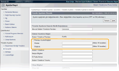 Makinede yapılandırılmış ayarların Uzak Kullanıcı Ara Biriminden değiştirilmesi yönetsel ayrıcalıklar gerektirir. Sistem Yöneticisi parolasın değiştirmek için, aşağıda belirtilmiş olan yordamı uygulayın. Sistem Yöneticisi ayarlarına ilişkin bilgile, makinenin güvenliği açısından kritik öneme sahiptir, bu nedenle, Sistem Yöneticisi parolasının yalnızca yöneticiler tarafından bilinmesini güvence altına alın.