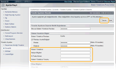Sistem Yöneticisi adını ve iletişim bilgilerini gereken biçimde girin ve [Tamam] öğesini tıklayın.