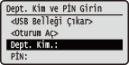 Eğer Departman Kimliği Yönetimi etkinleştirilmiş iseKullanıcılar, USB bellek aygıtındaki bir dosyayı veya SD kartta saklanan bir belgeyi işletim panelinden yazdırmayı denediklerinde, kimlik doğrulama ekran sayfası görüntülenir. Departman Kimliğini ve PIN'ini girin ve Oturum Aç> öğesini seçin ve  öğesine basın. | |