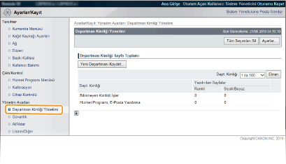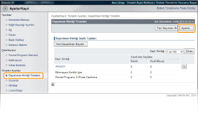 1 | [Kullanıcı Yönetimi] içinde [Departman Kimliği Yönetimi] öğesini seçin, sonra da aşağıda yer alan [Ayarlar] öğesine tıklayın. |