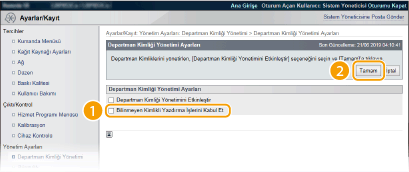 Eğer onay kutusunun işaretini kaldırırsanız, kullanıcılar, Departman Kimliği Yönetimi tarafından desteklenmeyen bir yöntemle yazdırma yapamaz veya Uzak Kullanıcı Ara Biriminden Yönetim Moduna oturum açan kullanıcılar, Doğrudan Yazdırma gerçekleştiremez.