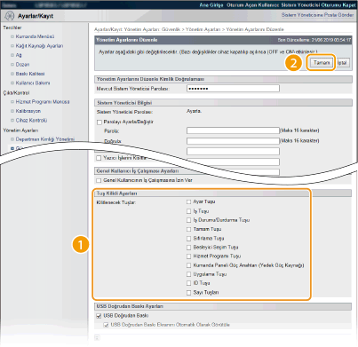 İlgili tuşu, işletim panelinden basıldığında bile, kilitlenmiş duruma getirmek için onay kutusunu seçebilirsiniz. Tuşun kilidini açmak için onay kutusunun işaretini kaldırın. Kurulum tuşunu ayrıca, panel işletim panelinden de (