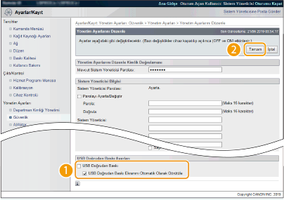 Bir USB bellek aygıtından yazdırmayı devre dışı bırakmak için onay kutusunun işaretini kaldırın. Bir USB bellek aygıtından yazdırmayı etkinleştirmek için onay kutusunu işaretleyin. Eğer aynı zamanda [USB Doğrudan Baskı Ekranını Otomatik Olarak Görütüle] onay kutusunu da işaretlerseniz, Bir USB bellek aygıtı makineye takıldığı zaman, USB Doğrudan Yazdırma ekran sayfası otomatik olarak görüntülenir.