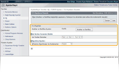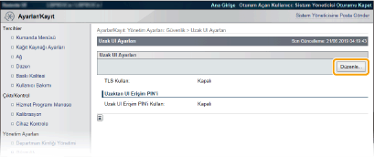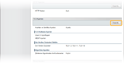 TLS, [Uzak UI Ayarları] veya [IPP Baskı Ayarları] tarafından hâlihazırda etkinleştirilmiş olduğunda, [Varsayılan Anahtar Ayarları] öğesi görüntülenmez. Kullanılacak anahtarı değiştirmek için, bkz. 6. adım ve sırasıyla, [Uzak UI Ayarları] veya [IPP Baskı Ayarları] altındaki [TLS Kullan] onay kutularını işaretleyin.