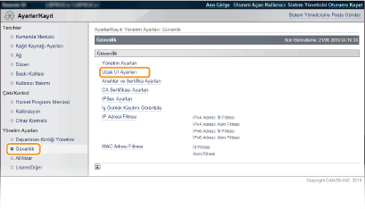 1 | [Güvenlik]  [Uzak UI Ayarları] öğesine tıklayın. |