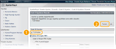3 | [TLS Kullan] onay kutusunu seçin ve [Tamam] öğesine tıklayın. [TLS Kullan] TLS'yi Uzak Kullanıcı Ara Birimi ile iletişim için kullandığınızda, bu onay kutusunu seçin. Kullanmadığınızda, onay kutusunun işaretini kaldırın. |