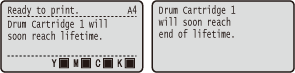 Keď sa hlásenie <Ready to print.> nezobrazí, tlač sa dočasne zastaví. Ak chcete pokračovať v tlači, stlačte tlačidlo  (  ). To, ktoré hlásenie sa má zobraziť, závisí od nastavenia <Action When Warning> v ponuke nastavení na ovládacom paneli. Action When WarningMôžete nastaviť ľubovoľnú hodnotu ako percentuálnu hodnotu zostávajúceho množstva tonera v bubnovej kazete, ktoré spustí túto správu. Spec Drum Chk Timing |