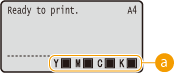 Keď sa zobrazí hlásenie <End of lifetime reached. Change X toner cartridge. (Dosiahol sa koniec životnosti. Vymeňte tonerovú kazetu X.)>, tlač sa dočasne zastaví. Ak chcete pokračovať v tlači, stlačte tlačidlo  (  ). To, ktoré hlásenie sa má zobraziť, závisí od nastavenia <Action When Tnr. Out> v ponuke nastavení na ovládacom paneli. Action When Tnr. Out |