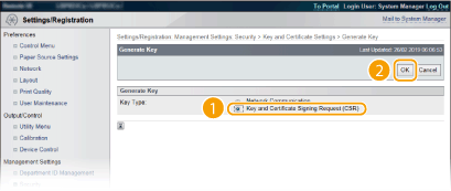 Vyberte položku [Key and Certificate Signing Request (CSR)] a kliknite na položku [OK].
