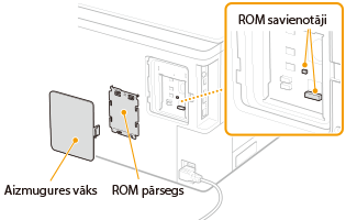 Šajā sadaļā aprakstīts, kā uzstādīt iekārtā papildu ROM. ROM izmanto pievienotu ROM savienotājiem zem iekārtas aizmugurējā vāka. Pirms ROM uzstādīšanas izlasiet sadaļā Uzstādīšana izklāstītos piesardzības norādījumus. | ![]() |