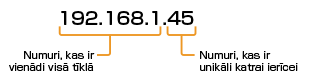 IP adresē ir četri skaitļi, kas atdalīti ar punktu (.) (piemērs: 192.168.1.45). Katram skaitlim jābūt robežās no 0 līdz 255. Pamatā pirmie trīs skaitļi jāiestata vienādi ar maršrutētāja skaitļiem, jo tie ir vienādi visā tīklā. Nosakiet pēdējo skaitli (piemēram, 45 skaitļu virknējumā 192.168.1.45), kas atšķiras no skaitļa citās ierīcēs.