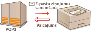 E-pasta ziņojuma drukāšanas funkcija (E-Mail Print) ļauj drukāt ziņojumus un pievienotos attēlu failus, kas saņemti no POP3 pasta servera, neizmantojot datoru. E-pasta ziņojumus var saņemt manuāli, kā arī regulāri saņemt automātiski. Izmantojot SMTP protokolu, tiks izdrukāti e-pasta ziņojumi, kas nosūtīti uz iekārtu no pasta servera.