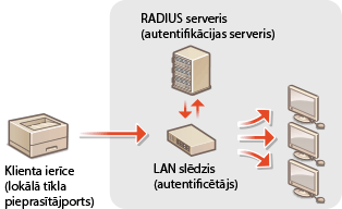 Iekārta var izveidot savienojumu ar 802.1X tīklu kā klienta ierīce. Standarta 802.1X tīkls sastāv no RADIUS servera (autentifikācijas serveris), LAN slēdža (autentificētājs) un klienta ierīcēm ar autentifikācijas programmatūru (lokālā tīkla pieprasītājportiem). Ja ierīce mēģina izveidot savienojumu ar 802.1X tīklu, ierīcei jāveic lietotāja autentifikācija, lai pārliecinātos, vai savienojumu veic autorizēts lietotājs. Autentifikācijas informācija tiek nosūtīta uz RADIUS serveri, kur tā tiek pārbaudīta. Šis serveris atļauj vai aizliedz sakarus ar tīklu atkarībā no autentifikācijas rezultāta. Ja autentifikācija neizdodas, LAN slēdzis (jeb piekļuves punkts) bloķē piekļuvi no tīkla ārpuses.