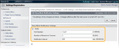 2 | Pažymėkite žymės langelį [Notify] ir nurodykite reikiamus parametrus. ![]() [Notify] Pažymėkite šį žymės langelį, kad įrenginių valdymo programinei įrangai būtų pranešama apie aparato maitinimo būseną. Jei pasirinkta [Notify], galite palaukti, kad būtų išvengta bereikalingo ryšio užmezgimo aparatui veikiant budėjimo režimu ir sumažintas energijos suvartojimas. [Port Number] Pakeiskite šios funkcijos prievado numerį atsižvelgdami į tinklo aplinką. [Number of Routers to Traverse] Nurodykite, kiek maršrutizatorių gali pereiti pranešimų paketai. [Notification Interval] Nurodykite, kaip dažnai aparatas praneš įrenginių valdymo programinei įrangai apie savo maitinimo būseną. |