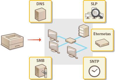 Tinklo konfigūravimas skiriasi atsižvelgiant į tinklo paskirtį. Aparatas sukurtas taip, kad būtų suderinamas su kiek įmanoma daugiau tinklo konfigūracijų, taip pat jame yra įvairių technologijų. Pasitarkite su tinklo administratoriumi ir nustatykite jūsų tinklo aplinką atitinkančią konfigūraciją.