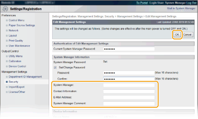Įveskite sistemos administratoriaus vardą ir kontaktinę informaciją, kaip reikalaujama, ir spustelėkite [OK].