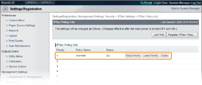Politika taikoma nuo esančios aukščiausioje padėtyje iki žemiausioje. Spustelėkite [Raise Priority] arba [Lower Priority], kad perkeltumėte strategiją aukštyn arba žemyn.