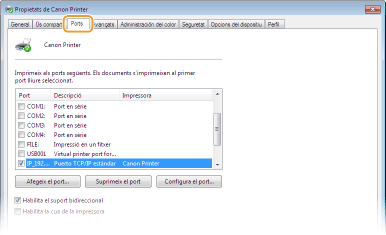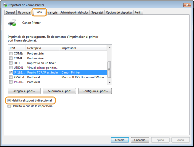 A la pestanya [Ports], assegureu-vos que la casella [Habilita el suport bidireccional] estigui marcada.