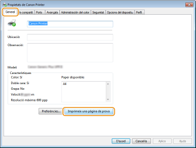 Feu clic a [Imprimeix una pàgina de prova] a la pestanya [General].