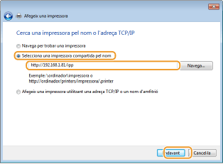 Seleccioneu [Selecciona una impressora compartida pel nom], inseriu una destinació de connexió i feu clic a [Següent].