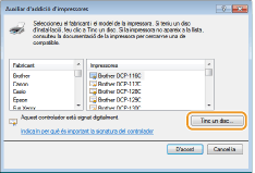 Per establir el protocol d'impressió IPP o IPPS, instal·leu el controlador d'impressora mitjançant el procediment a continuació que s'adapti al sistema operatiu de l'ordinador. El controlador de la impressora s'inclou al CD-ROM/DVD-ROM de programari de l'usuari que ve amb l'equip. Inseriu el CD-ROM/DVD-ROM de programari de l'usuari a la unitat de l'ordinador abans de començar el procediment.