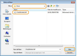 Especifiqueu la carpeta on hi ha desats els controladors, seleccioneu el fitxer INF i feu clic a [Obre].
