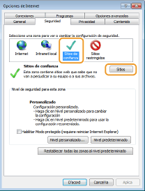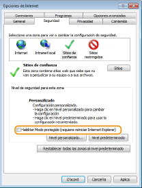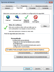 Desmarqueu la casella [Habilita el mode protegit (cal reiniciar l'Internet Explorer)] si està marcada.