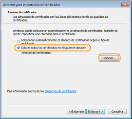 Seleccioneu [Col·locar tots els certificats a la botiga següent] i feu clic [Navega].