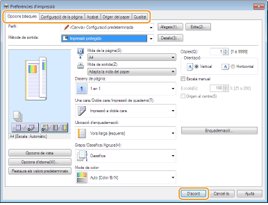 Seleccioneu [Impressió protegida] a [Mètode de sortida].
