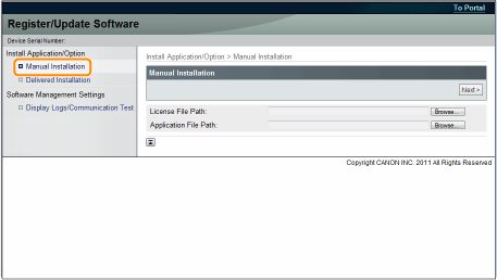 From the top page of the Remote UI, click [Settings/Registration] → [License/Other] → [Register/Update Software].