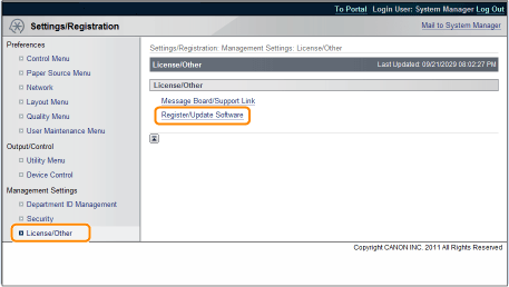 From the top page of the Remote UI, click [Settings/Registration] → [License/Other] → [Register/Update Software].