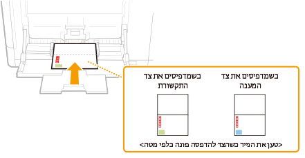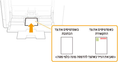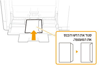 חלק זה מתאר כיצד לטעון מעטפות בכיוון הרצוי, וכן את התהליכים שיש להשלים לפני טעינת מעטפות או גלויות. עבור התהליך הכללי לטעינת מעטפות או גלויות במגש הרב-תכליתי, עיין ב טעינת נייר במגש הרב-תכליתי. |