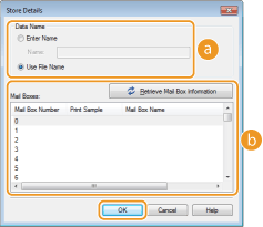 [Mail Boxes]המקום המשמש לאחסון נתוני הדפסה בכרטיס ה-SD נקרא קופסה. בחר את המספר של הקופסה שבה תרצה לאחסן את המסמך. באפשרותך להקצות שם לקופסה כדי שניתן יהיה לזהות את הקופסה.
