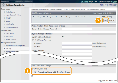 علامت کادر انتخاب را بردارید تا چاپ مستقیم از دستگاه USB غیرفعال شود. کادر انتخاب را علامت بزنید تا امکان چاپ کردن از دستگاه USB فعال شود. اگر کادر انتخاب [Automatically Display USB Direct Print Screen] را علامت بزنید، هنگامی که دستگاه USB به دستگاه متصل میشود، صفحه چاپ مستقیم از USB بهصورت خودکار نمایش داده خواهد شد.