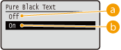 برای زمانی که نوشتار سیاه در پس زمینه رنگی یا شکل رنگی قرار دارد، نحوه چاپ را مشخص کنید. زمانی که <Pure Black Text> روی <Off> تنظیم شده باشد، این مورد نشان داده نمیشود.