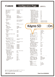 Εκτυπώστε τη Σελίδα Διαμόρφωσης, και η κάρτα SD έχει τοποθετηθεί σωστά αν επιλογή «SD Card» στο «Control Menu» είναι «On». ![]() Εάν δεν υποδεικνύονται πληροφορίες κατάστασης κάρτας SD Η κάρτα SD δεν έχει εγκατασταθεί σωστά. Αφαιρέστε την κάρτα SD από τη συσκευή και τοποθετήστε την ξανά. | ![]() |