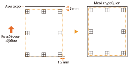 Στο παράδειγμα που εμφανίζεται παρακάτω, για να μετατοπιστεί η θέση εκτύπωσης κατά 5 mm προς τα επάνω και κατά 1,5 mm προς τα δεξιά, καθορίζετε "-5,0 mm" στο <Offset Y> και "+1,50 mm" στο <Offset X>.