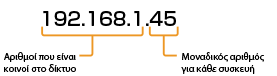 Μια διεύθυνση IP αποτελείται από τέσσερις αριθμούς διαχωρισμένους με τελείες (.) (παράδειγμα: 192.168.1.45). Κάθε αριθμός πρέπει να βρίσκεται μεταξύ 0 και 255. Γενικά, ορίζετε τους τρεις πρώτους αριθμούς να είναι ίδιοι με εκείνους του δρομολογητή, επειδή είναι κοινοί στο δίκτυο. Προσδιορίστε τον τελευταίο αριθμό (για παράδειγμα, το 45 στον αριθμό 192.168.1.45) που διαφέρει από τον αριθμό των άλλων συσκευών.
