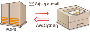 Η εκτύπωση e-mail σάς επιτρέπει να εκτυπώσετε το μήνυμα και τα συνημμένα αρχεία εικόνας ενός e-mail που λαμβάνονται από το διακομιστή αλληλογραφίας POP3, χωρίς να χρησιμοποιήσετε υπολογιστή. Μπορείτε να λαμβάνετε e-mail με μη αυτόματο τρόπο, καθώς και αυτόματα σε τακτά διαστήματα. Όταν χρησιμοποιείται το πρωτόκολλο SMTP, τα e-mail που αποστέλλονται απευθείας στη συσκευή χωρίς να μεσολαβεί διακομιστής αλληλογραφίας, εκτυπώνονται.