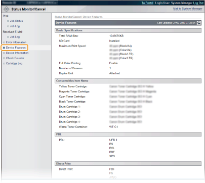 Μπορείτε να προβάλλετε τις πληροφορίες, συμπεριλαμβανομένης της μέγιστης ταχύτητας εκτύπωσης, και χαρακτηριστικά της συσκευής.