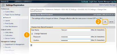 3 | Ορίστε σωστά το όνομα χρήστη/συνθηματικό και κάντε κλικ στο [OK]. [User Name] Εισαγάγετε αλφαριθμητικούς χαρακτήρες για το όνομα χρήστη. [Change Password] Για να ορίσετε ή να αλλάξετε το συνθηματικό, επιλέξτε το πλαίσιο ελέγχου και πληκτρολογήστε αλφαριθμητικούς χαρακτήρες για τον νέο κωδικό πρόσβασης στα πλαίσια κειμένου [Password] και [Confirm]. |