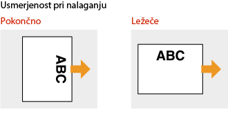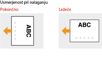 To poglavje v glavnem opisuje nalaganje potiskanega papirja v pravi smeri in postavitvi. Splošna navodila za nalaganje papirja v kaseto za papir ali na večnamenski pladenj najdete v spodnjih poglavjih. |