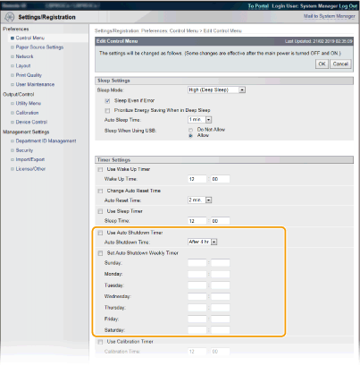 Potrdite polje za izklop napajanja, ko poteče čas, ki je nastavljen v polju [Auto Shutdown Time].