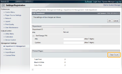 Tiskanje rezultatov preverjanjaNastavitev števca strani na ničČe želite števec ponastaviti na nič za vsak posamezni oddelek, kliknite besedilno povezavo pod [Dept. ID] in kliknite [Clear Count]  [OK]. Če želite števec ponastaviti na nič za vse oddelke, kliknite [Clear All Counts]  [OK]. |