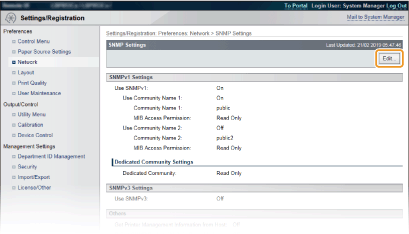 Protokol SNMP (Simple Network Management Protocol) je namenjen spremljanju in upravljanju komunikacijskih naprav v omrežju, za kar uporablja bazo MIB (Management Information Base). Naprava podpira SNMPv1 in SNMPv3, ki ima izboljšano varnost. Stanje naprave lahko preverite v računalniku, ko tiskate dokumente ali uporabljate Remote UI (Oddaljeni uporabniški vmesnik). Omogočite lahko SNMPv1 ali SNMPv3 ali oboje. Določite nastavitve posamezne različice, ki bo ustrezala vašemu omrežnemu okolju in namenu uporabe.