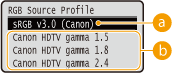 sRGB v3.0 (Canon)  Canon HDTV gama 1.5 Canon HDTV gama 1.8 Canon HDTV gama 2.4 |
