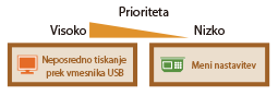 Prioriteta nastavitevNastavitve, konfigurirane v gonilniku tiskalnika, preglasijo nastavitve, konfigurirane na operacijski plošči. | | Če izvedete neposredno tiskanje prek USB-ja ali neposredno tiskanje, nastavitve, ki so določene za tiskanje ali shranjene v podatkih TIFF, preglasijo nastavitve, določene na operacijski plošči. | |